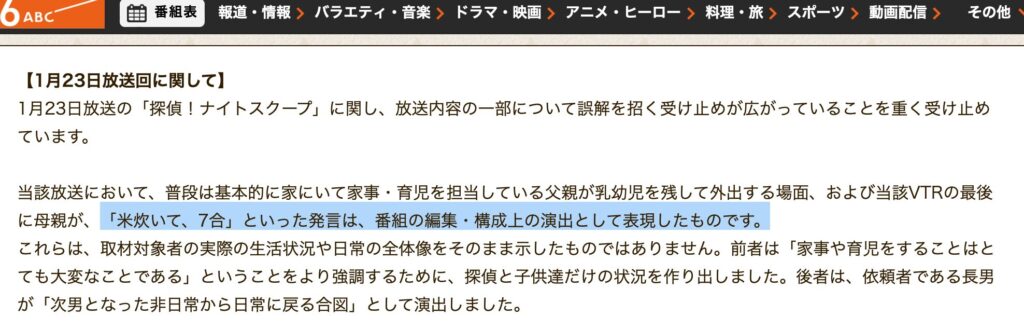 とくに番組終了間際に母親のセリフ「米炊いて!7合!」といったセリフが演出によるものだったと番組が公式に認めています。
